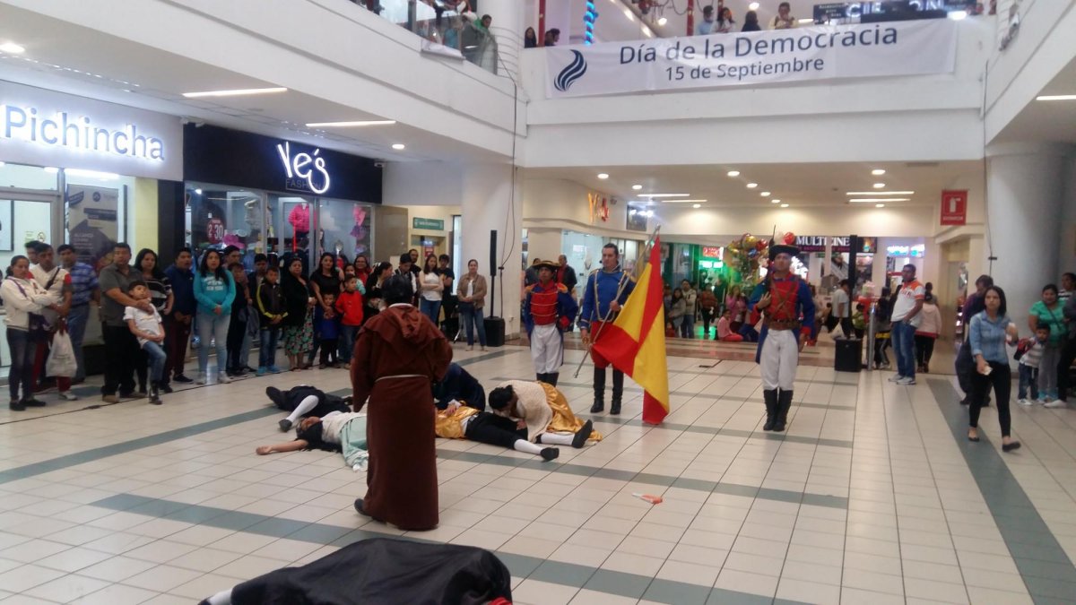 En este espectáculo artístico —que se realizó en la tarde de hoy, 15 de septiembre, en el centro comercial El Recreo (Quito)— un grupo de actores caracterizó a los personajes involucrados en la matanza que conmovió a toda América que entonces luchaba por su libertad.