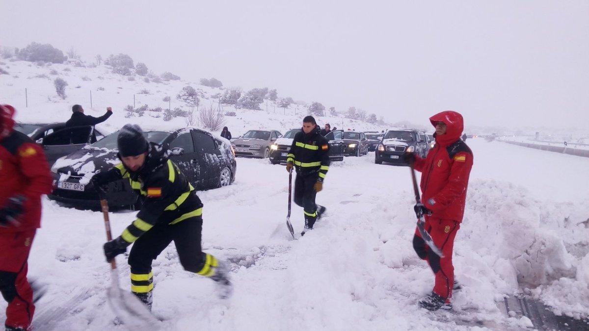 Soldados y bomberos usaron quitanieves para intentar despejar el paso y distribuyeron mantas y bebidas calientes a los conductores retenidos, según imágenes difundidas por la televisión española.