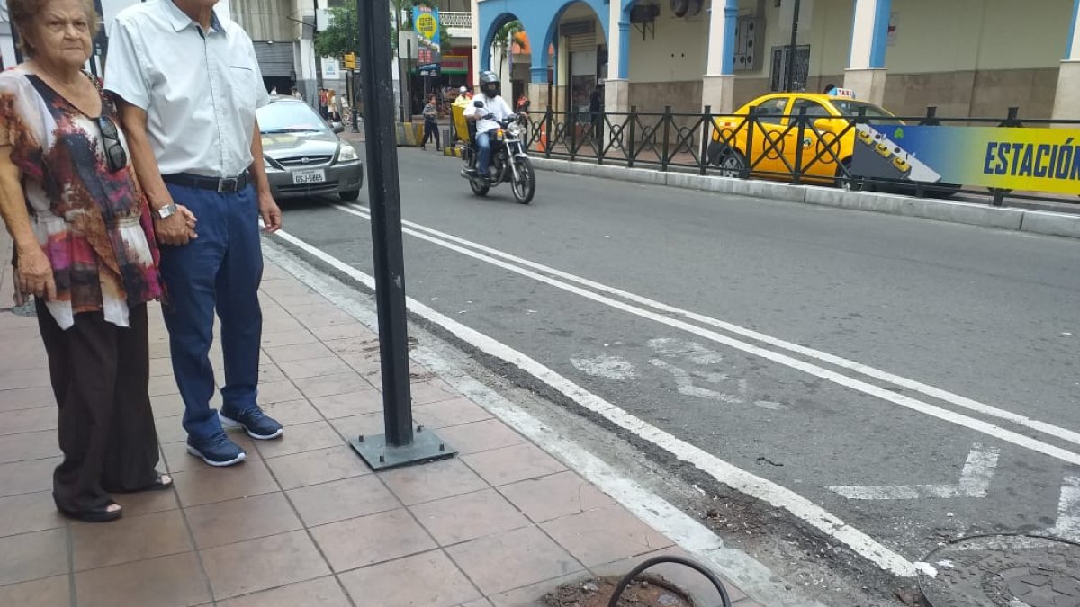 Dos postes de alumbrado público han sido retirados en un tramo de la acera de la calle Chile, a la altura de la avenida 9 de Octubre, en el centro de Guayaquil. Los residentes y dueños de los locales comerciales de la zona se mostraron sorprendidos por la falta de esas columnas.