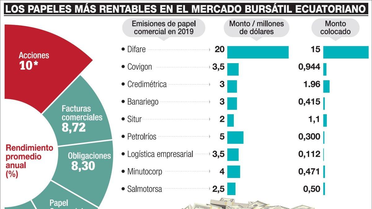 Y desde hace dos años se dinamizan en las bolsas de valores las facturas comerciales. Germán Cobos, de la casa de valores Silvercross, estima que en el año que corre, este papel llegará a $ 400 millones en negociaciones, debido al corto plazo en que se lo emite y al retorno que tiene. Pero también pagan bien las acciones de Corporación Favorita, Holcim, Cervecería o los bancos Guayaquil, Produbanco, Pichincha.
