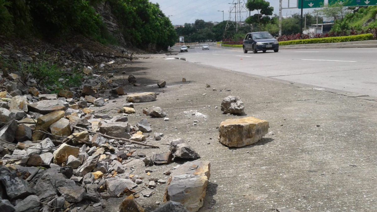 En la entrada al túnel San Eduardo, noroeste de Guayaquil, decenas de rocas se hallan a lo largo de la vereda y en parte de la calzada, este jueves 21 de marzo de 2019.