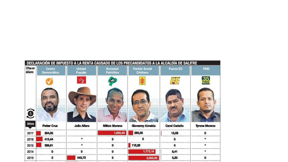 Alfaro, Cruz y Moreno son solo tres precandidatos. El hermano de este último, Milton Moreno, aspirará también a la Alcaldía por el partido Sociedad Patriótica. La lista, de momento, la completa Giovanny Almeida, por el Partido Social Cristiano; y Carol Cedeño, por el partido Fuerza EC.