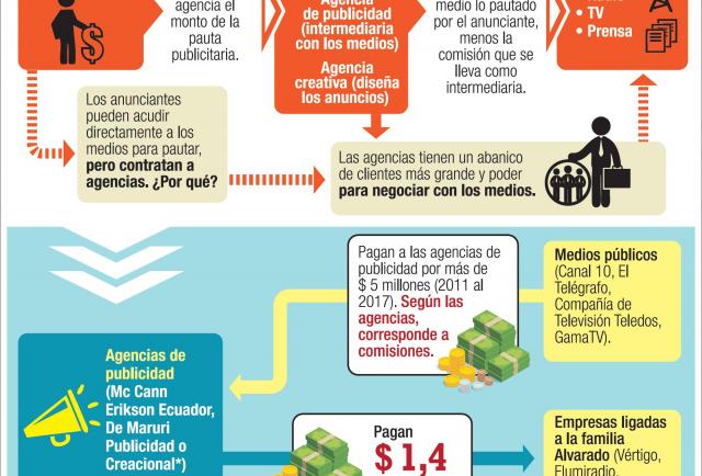 De acuerdo con la información financiera -ahora indagada en Fiscalía y Contraloría-, hay medios públicos que pagaron a agencias de publicidad más de 5 millones de dólares entre 2011 y 2017. Y estas hacían transferencias a su vez a compañías, asimismo del mundo comunicacional, donde Fernando y Vinicio Alvarado o sus familiares son o habían sido accionistas o administradores en la última década.