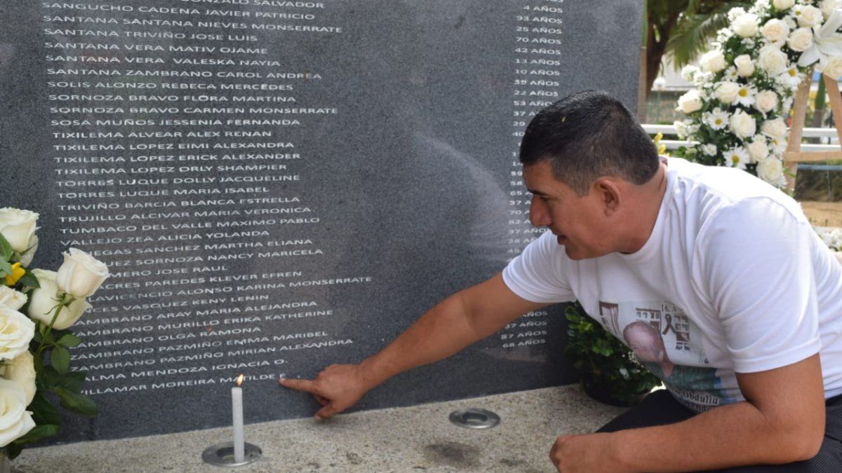 Jaime Macías Palma se dirige hasta el memorial ubicado en Tarqui, la zona más afectada por el terremoto del 16 de abril, en Manta, provincia de Manabí. Coloca una vela, con su dedo señala el penúltimo de los 209 nombres que allí se encuentran.