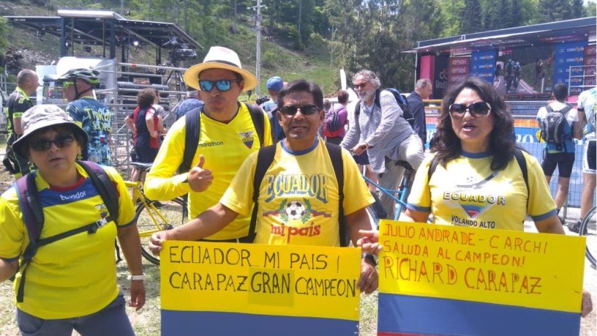 Vestidos con la camiseta de Ecuador y portando carteles de apoyo, cuatro ecuatorianos estuvieron en Monte Avena para recibir a Richard Carapaz, el 1 de junio de 2019.