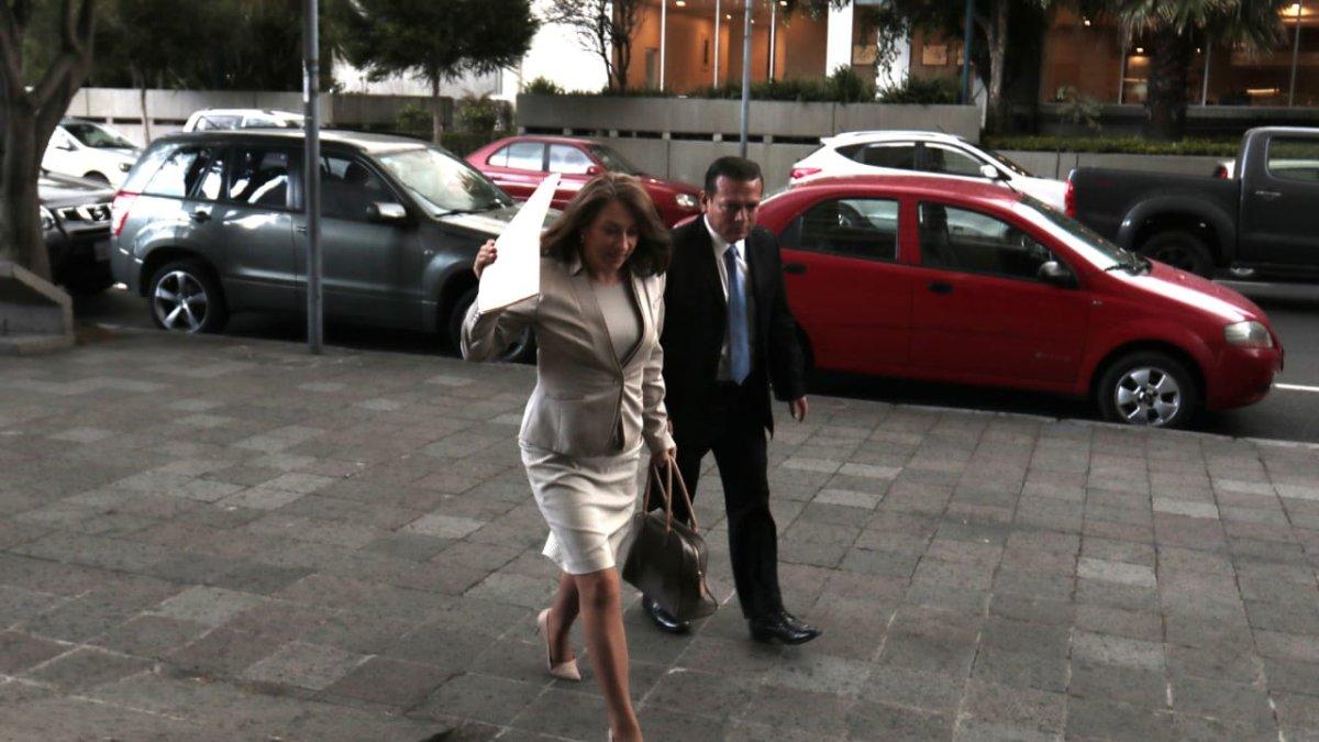 La legisladora ingresó a la Fiscalía, pasadas las 15:00, cubriéndose la cabeza con una carpeta, pues en ese momento inició la lluvia en el norte de Quito. Detrás de Buendía ingresó el abogado y exlegislador Gabriel Rivera.