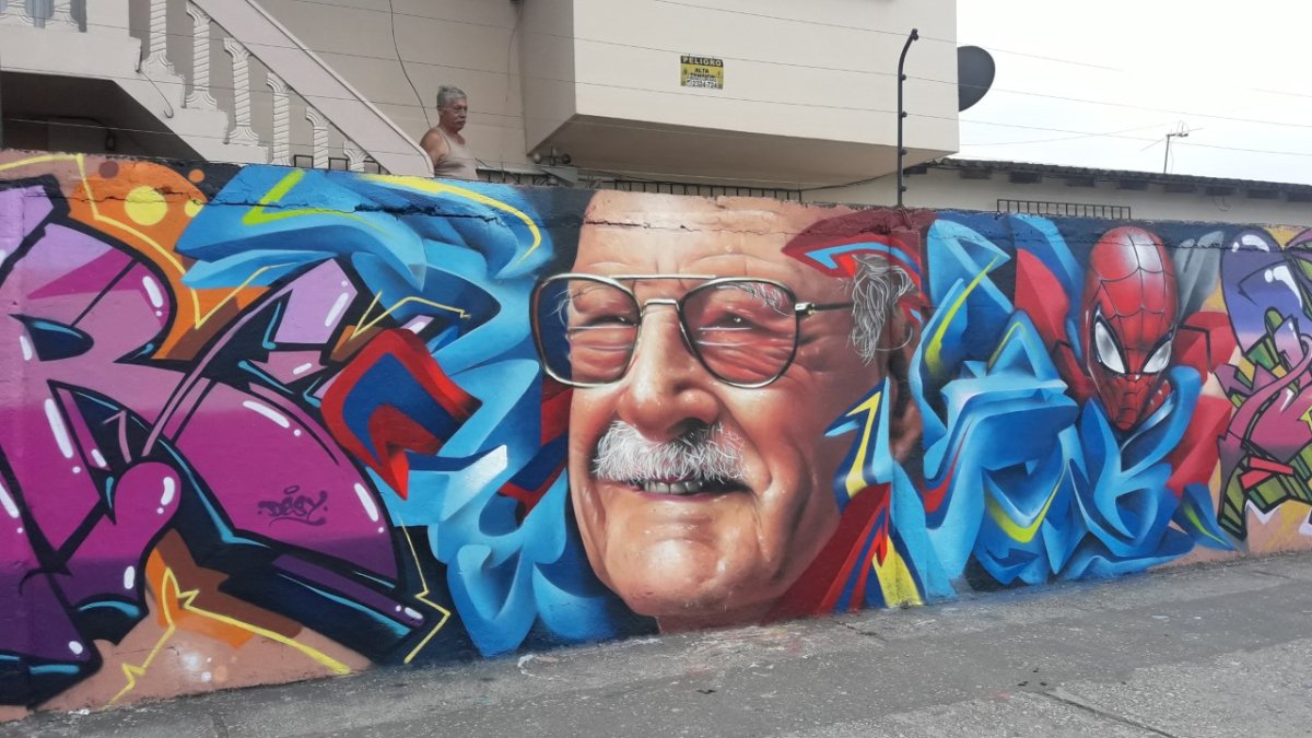Un colorido mural de 2 metros de ancho por 12 de largo, con la figura de Stan Lee, escritor y editor de cómics estadounidense, llama la atención de quienes a diario transitan por la avenida 25 de Julio, a la altura de la manzana 1 de la ciudadela Amazonas, en el sur de Guayaquil.