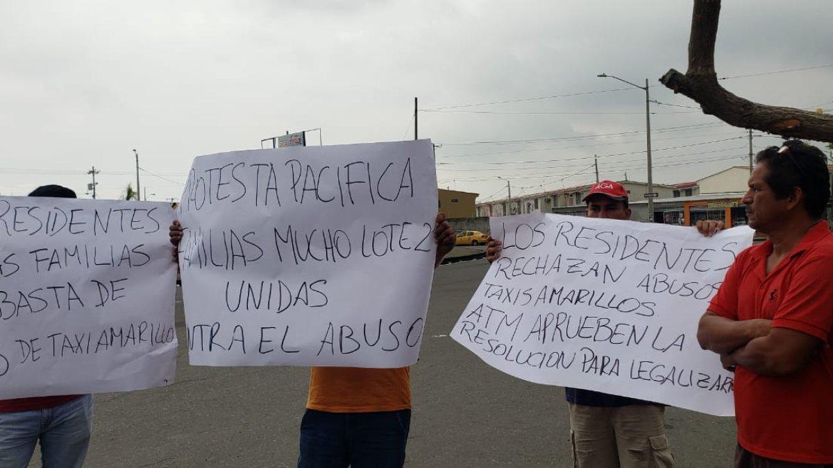 Desde las 07:00 de este martes 23 de abril, un grupo de residentes, que presta el servicio de taxi ejecutivo, en la urbanización Mucho Lote 2, situada en la autopista Narcisa de Jesús, se levantó con carteles para pedir la regularización de sus vehículos, con la finalidad de que puedan prestar el servicio de taxi.