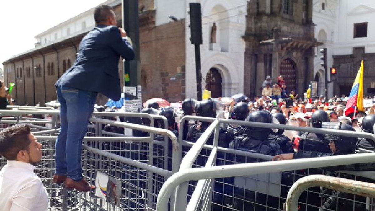 Ya en el centro de Quito, los taxistas pidieron ser recibidos por la Presidencia, mientras que la Policía intentaba impedir que ingresen a la Plaza Grande. El viceministro de Transporte y Obras Públicas, Iván Carvallo, fue quien hizo el primer acercamiento.