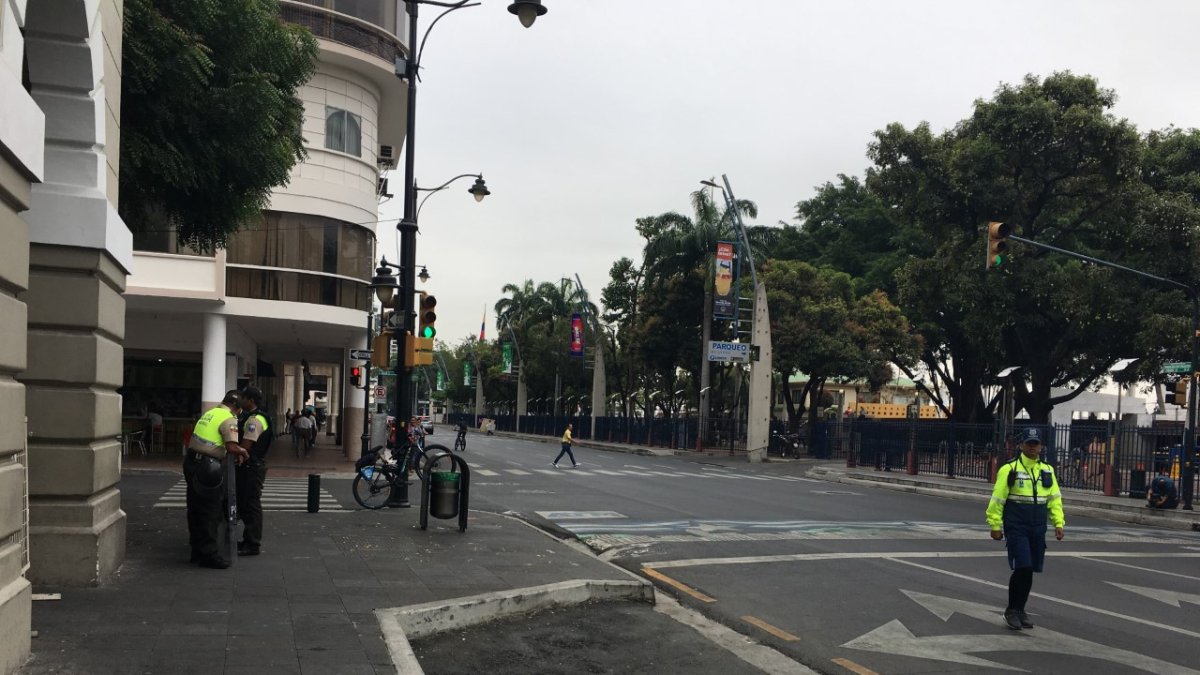 Ese sector del centro y otras avenidas como la 9 de octubre, 10 de agosto, Aguirre, Pichincha, Clemente Ballén y el resto de calles que forman el casco comercial de la ciudad, lucían, como no es habitual, con poca circulación de vehículos hasta las 10:20. Luego el tránsito se reguló.