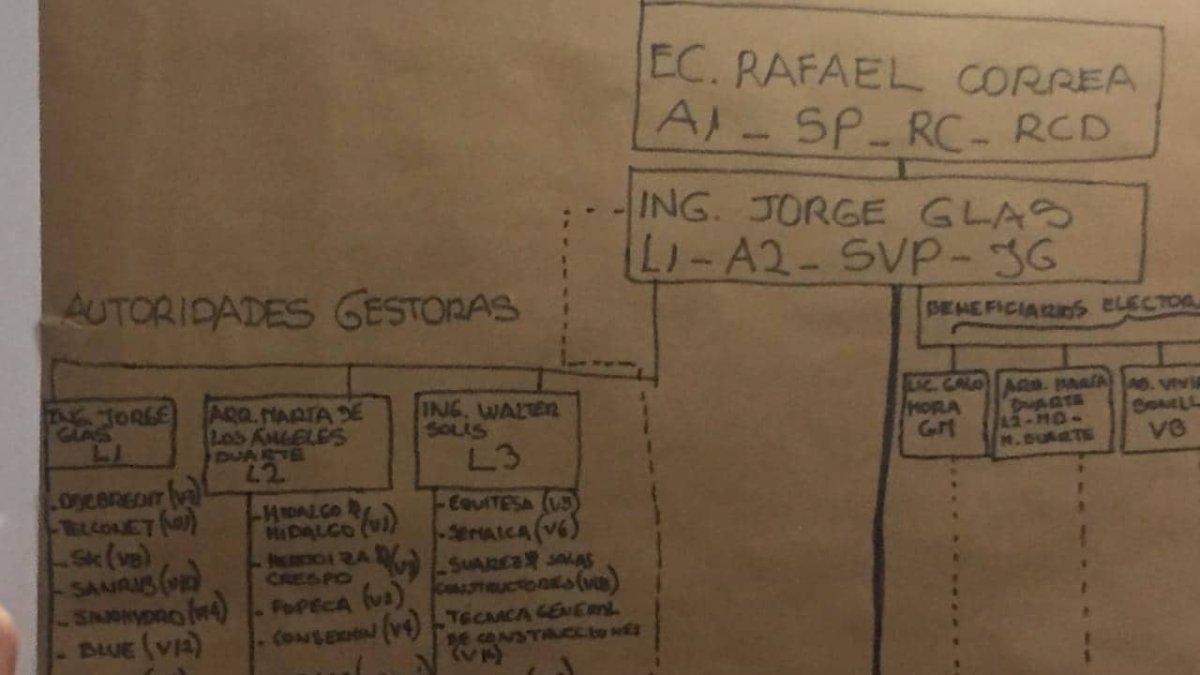 En un pizarrón localizado en la parte derecha de la sala se tomó media hora para elaborar un esquema sobre un papelógrafo. A Correa le asignó los códigos: A1, SP, RC, RCD. A Glas: L1, A2, SVP y JG. Distinguió autoridades gestoras y beneficiarias. A estas últimas puso beneficiarias electorales y otros beneficiarios.