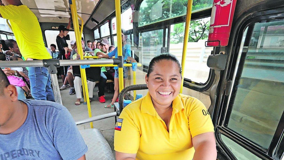 Es oriunda de Guano, en Chimborazo, pero llegó a Guayaquil hace tres meses y asegura que ser conductora de transporte urbano la hace sentir plena. Además, en esa labor conoció a su esposo Wilson Yépez, quien la ayuda como oficial.