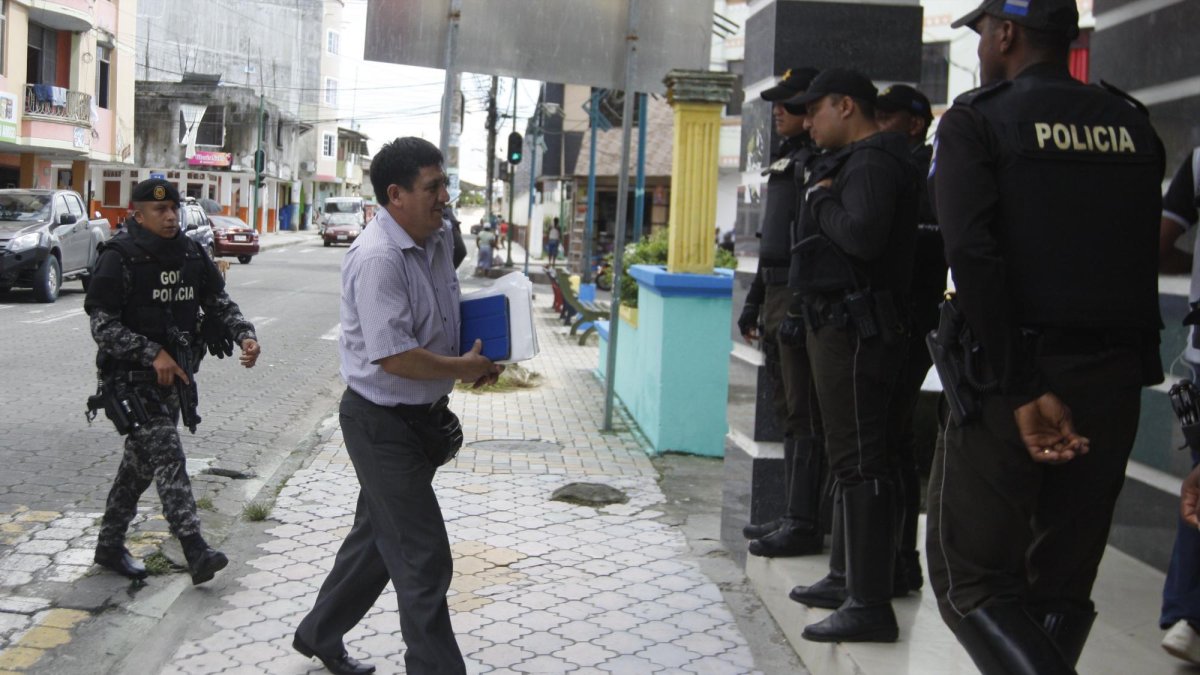 Los policías del Grupo de Operaciones Especiales (GOE) estaban vigilantes en las afueras de la Unidad Judicial Multicompetente de San Lorenzo, en Esmeraldas. Se ubicaron en la puerta principal.