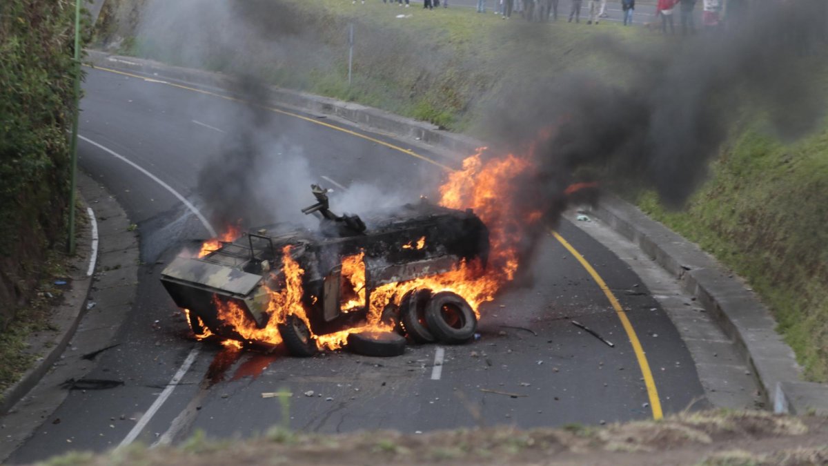 La tarde de este 7 de octubre, en el sector de Las Curvas de Santa Rosa, cantón Mejía, sur de la provincia de Pichincha, un blindado de las Fuerzas Armadas, que costaría entre 500 mil y 1 millón de dólares, fue interceptado e incendiado por centenares de indígenas.