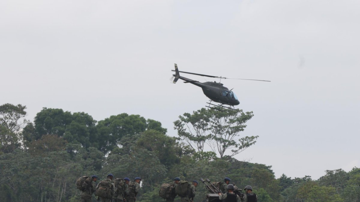 Los ojos de Erik Paredes, de 22 años, cadete de la Fuerza Aérea Ecuatoriana (FAE), brillan al observar cómo helicópteros TH-57, de rescate, hacen un vuelo a treinta metros de altura desde el terreno, para rescatar a los soldados.
