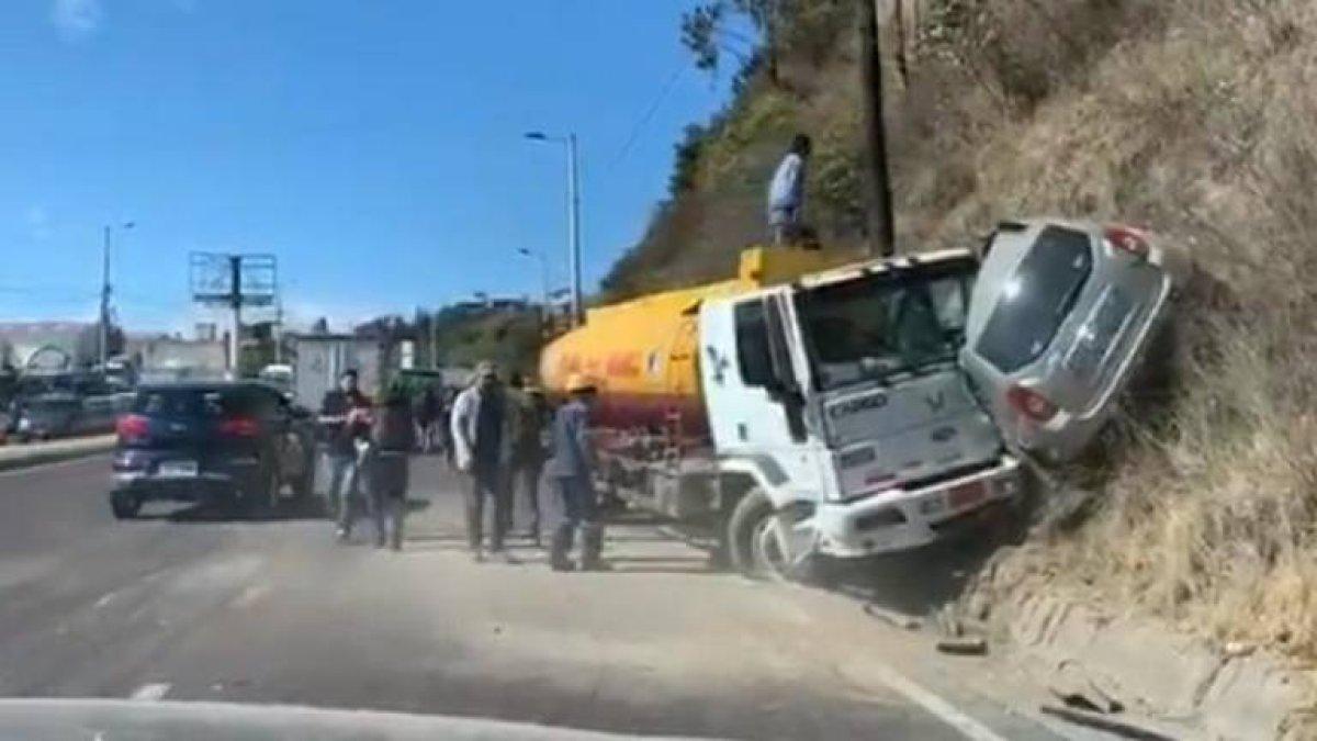 Un accidente de tránsito se registró la mañana de este viernes en la avenida Simón Bolívar, norte de Quito. La colisión, que quedó registrada en video, sucedió en la entrada a Nayón, en la ruta que va desde el norte hacia el sur.