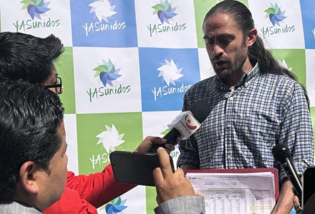 Pedro Bermeo, del colectivo YaSunidos, explica los motivos para la demanda en contra del presidente Daniel Noboa, por incumplimiento.Foto: CORTESÍA