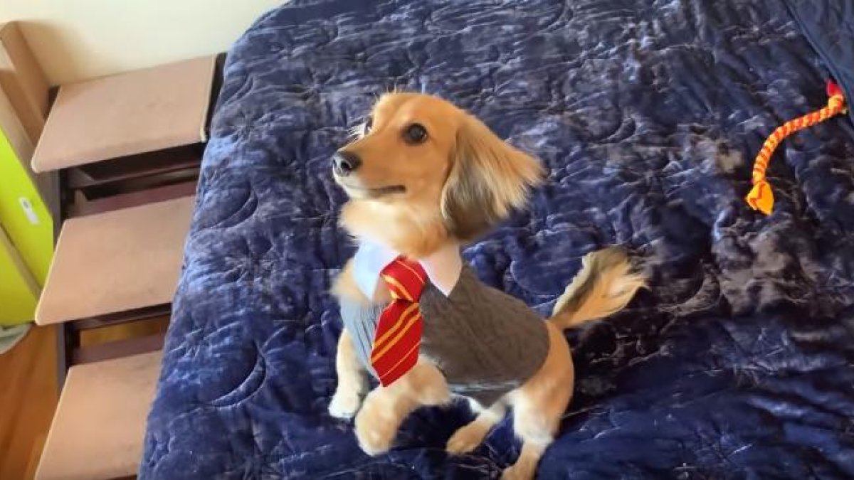 En el clip se observa como al pronunciar la frase “Wingardium Leviosa”, la mujer consigue que el can se pare en sus piernas traseras. A la voz de “Ascendio”, le informa que se suba a la cama.