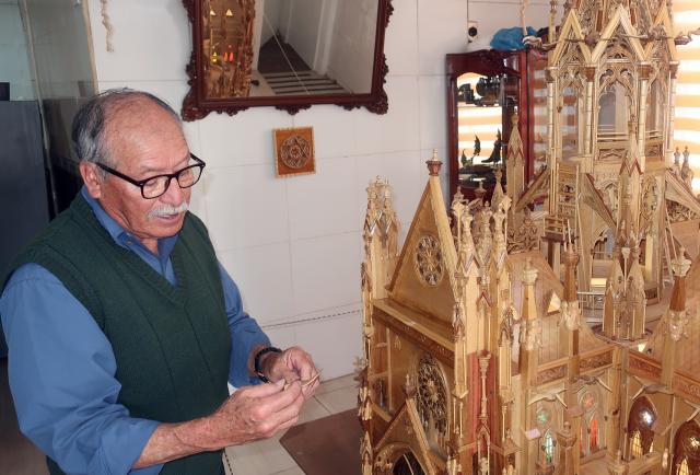 Carlos Tapia replicó el templo neogótico más grande de América, con pino, laurel y cedro