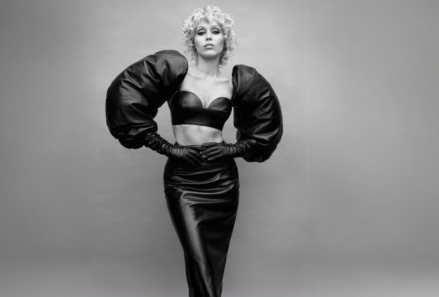 Mar Rendón lleva el cuero al extremo más artístico con un vestido de silueta estructurada y aberturas estratégicas. Los apliques metálicos resaltan el carácter vanguardista del diseño y hacen que cada movimiento refleje fuerza y presencia.