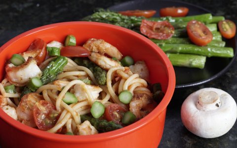 A continuación, incorpore la salsa pomodoro y los tomates cherry, cocine a fuego lento hasta que los sabores se integren. Mientras tanto, en otra sartén bien caliente, selle los camarones previamente sazonados con sal y pimienta. Finalmente, reúna todos los elementos, puede agregar un toque fresco con perejil o cilantro picado, y un hilo de aceite de oliva extra virgen para realzar los aromas. Sirva inmediatamente para disfrutar de todos los contrastes de texturas y sabores.