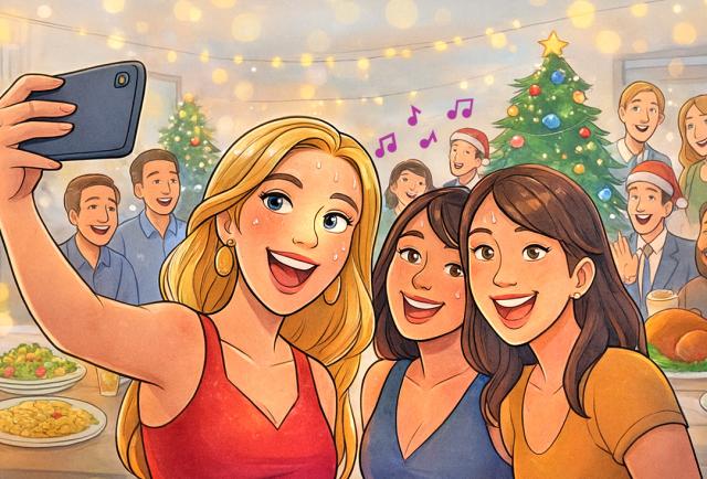 Aun así, antes de que el look se esfume por completo, comienza la sesión de fotos obligatoria: la grupal, la de las besties, la del árbol, la de la mesa decorada. Todo perfectamente ambientado con adornos navideños… y, cómo no, el pan de Pascua que nadie quiere pero que siempre aparece ‘por tradición’.