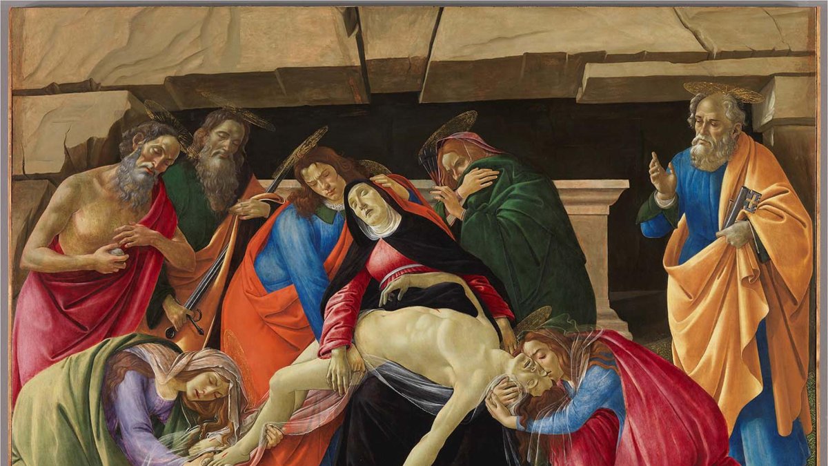 "Lamentación ante cristo muerto". Sandro Botticelli usó para algunas partes de la obra pintura al óleo mezclada con proteínas.