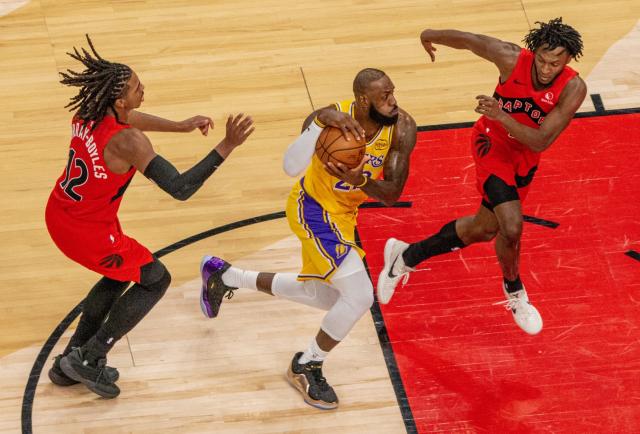 El base de los Raptors, Immanuel Quickley, le cortó el paso. LeBron podía haber tirado para intentar alcanzar los 10 puntos que habrían prolongado su récord anotador a 1.298 partidos.