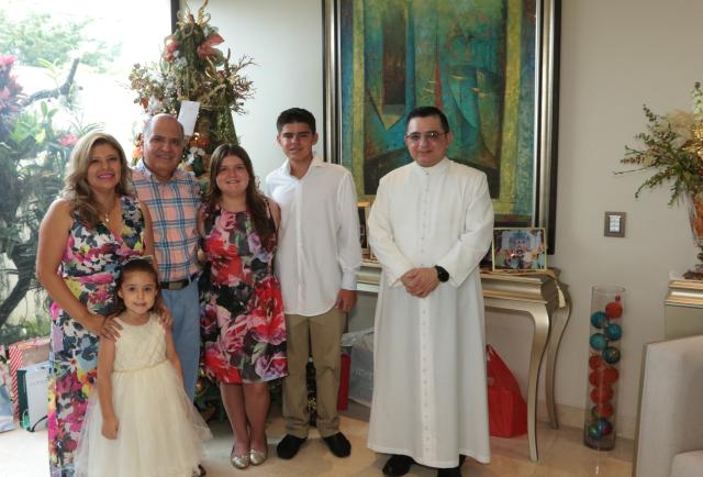 Mariuxi Montenegro de Ortiz, Carlos Ortiz, junto a sus hijos Mía Valentina, Carlos Eduardo y Gía Aracelly, y el padre Mauricio Romero.Juan Faustos // EXPRESO -