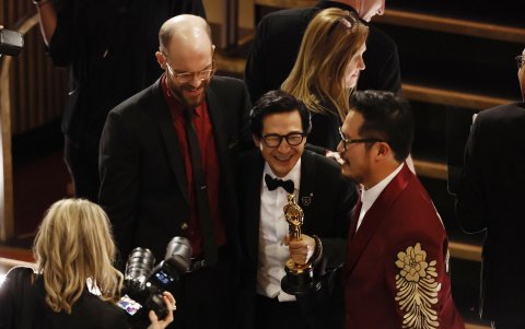 El elenco y el equipo celebran después de ganar el óscar a la mejor película por 'Everything Everywhere All at Once'.