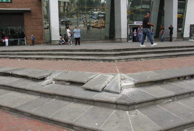 Yolanda Márquez salía del edificio del Servicio de Rentas Internas (SRI) el pasado miércoles, tras realizar trámites para su negocio. Era mediodía y, al descender por las escalinatas junto a la acera, sobre el costado de la avenida Francisco de Orellana, un tramo de la superficie saltó de su lugar. La mujer se desestabilizó, pero logró mantenerse en pie.