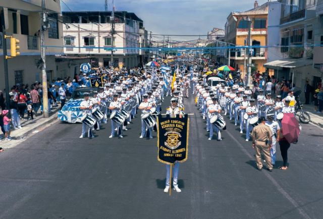 A lo largo de la calle 10 de Agosto, estudiantes de 45 instituciones educativas desfilaron con las banderas de Ecuador y Guayaquil, acompañados por las bandas musicales de sus colegios.