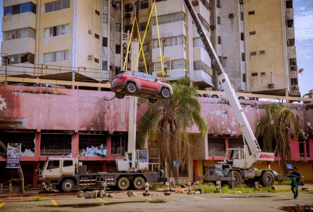 A través de grúas y con extremas medidas de seguridad, la mañana de este domingo 8 de marzo comenzó el retiro de los vehículos atrapados entre los escombros del edificio Multicomercio, que resultó afectado por un incendio registrado el miércoles 11 de febrero.