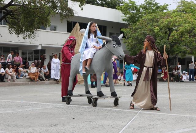 En escena, los estudiantes personificaron a los principales personajes del pesebre: el rey Herodes, el ángel Gabriel, José, María y los reyes magos. Cada aparición estuvo acompañada de narración y música, permitiendo que el público siguiera la historia con claridad y emoción.
