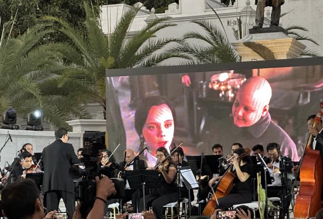 El mausoleo al expresidente Vicente Rocafuerte, servía de base a la orquesta. La estatua que yace en el lugar sobresalía sobre la pantalla colocada para mostrar imágenes de películas mientras sonaba la música.