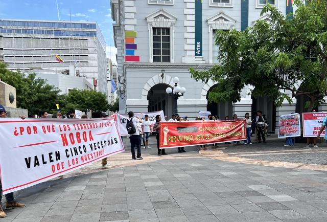 Esta postura fue transmitida a los vecinos por la abogada Mónica Luzárraga, quien asume su defensa legal. Durante la reunión, los moradores de la avenida Cacique Tomalá permanecieron en los bajos del Municipio, en la Plaza de la Administración, con lonas y carteles en mano, para exigir que el valor por metro cuadrado de sus predios no difiera del que se reconozca a las empresas vinculadas a la familia del presidente Daniel Noboa: Blasti S.A. e Industria Cartonera Ecuatoriana S.A.