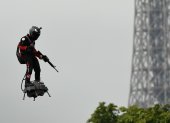 El campeón de jet-ski se robó el show del Día Nacional de Francia, al sobrevolar París en su plataforma volante.