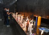 Los feligreses acuden a la Basílica construida con piedra volcánica negra y rojiza, culminada en 1929, ubicada en la ciudad de Baños en Ecuador.