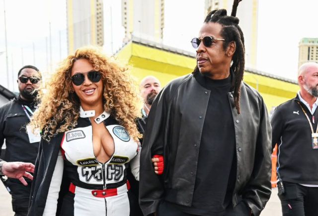 Acompañada por Jay-Z, la artista mezcla referencias del universo racing con alta costura, y el resultado es espectáculo puro.
