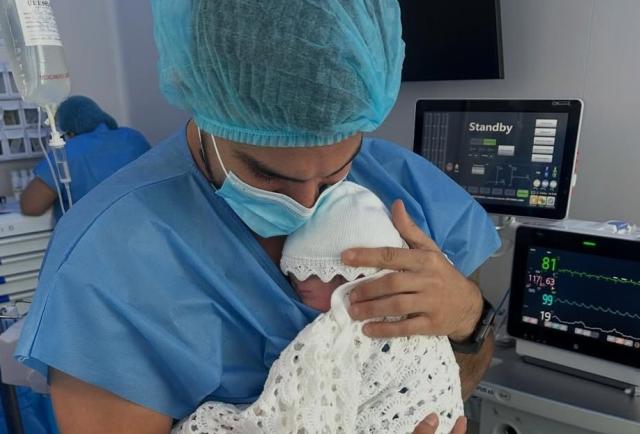 En las imágenes que compartió en sus redes sociales se lo ve en el quirófano, junto al equipo médico y acompañando a la nueva mamá, que atravesó largas horas de labor de parto. Luego aparece cargando, emocionado, a la recién nacida vestida con prendas blancas. “Es el mejor momento de mi vida”, expresó.