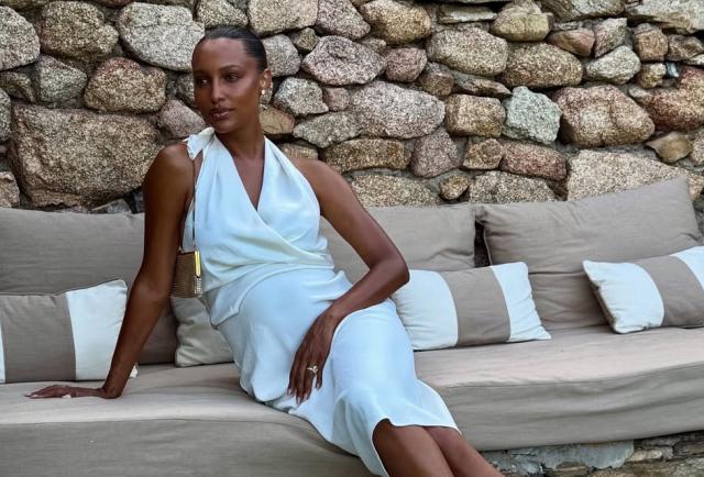 A sus 34 años, ella, que anunció su estado en julio pasado, cautivó sobre la pasarela de Nueva York, irradiando la felicidad de su maternidad, mientras llevaba un conjunto dorado de malla con sujetador marrón.