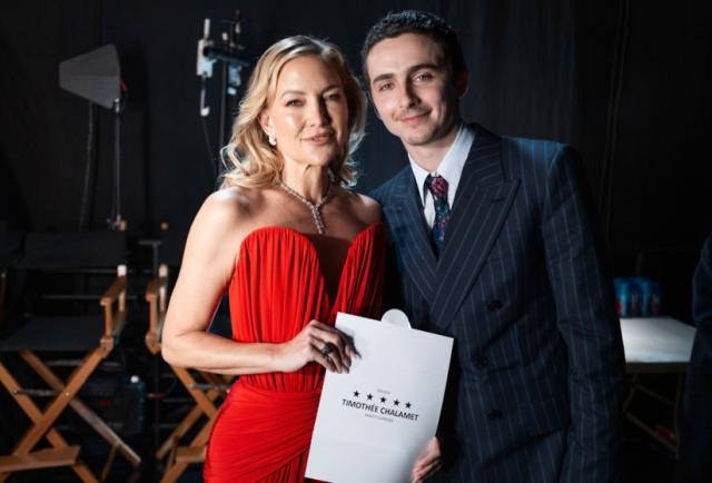 Kate Hudson también fue una de las grandes sensaciones de la noche. La rubia lució un coqueto vestido corto y asimétrico, con escote mariposa y drapeado.