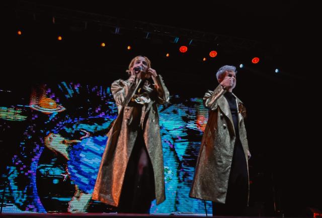A las 21:30, las pantallas del escenario proyectaron la llegada de un astronauta a un planeta rosa, una metáfora visual del Planeta Miranda. Minutos después, Ale y Juliana aparecieron con gabardinas doradas y lentes oscuros, en una estética de agentes secretos que daba inicio a una noche diseñada para “descifrar” la diversión.