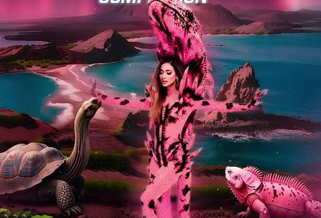 El traje típico se ajusta perfectamente a la figura de Samantha Quenedit y, al igual que la iguana rosada, destaca por su color rosado con rayas negras. El diseño incluye una imponente cabeza del reptil y una larga cola, logrando una representación audaz y llamativa de esta especie emblemática de Galápagos.