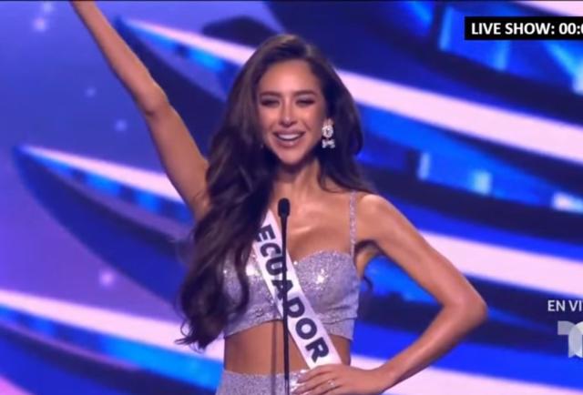 Mejía ingresó con un traje púrpura compuesto por top y minifalda brillante. Al momento de presentarse, dijo “Ecuador” con un tono dulce que generó una reacción inmediata del público en el recinto, que acompañó su paso con gritos y vítores.
