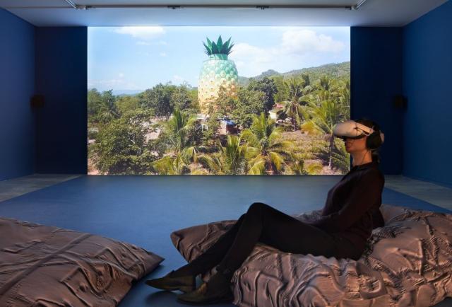 Uno de los aspectos más llamativos de la muestra es su instalación de realidad virtual, donde los visitantes pueden interactuar con Piña, una inteligencia artificial que representa un espíritu digital.