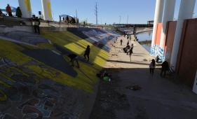 Decenas, incluyendo niños y mujeres, pernoctan a la altura de la puerta fronteriza 36. Esperan junto a una reja en el río Bravo