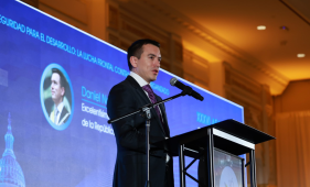 Daniel Noboa habla sobre amenaza narcoterrorista ante empresarios, en Estados Unidos