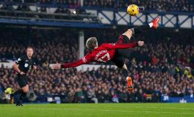 El delantero argentino del Manchester United abrió la cuenta en la goleada sobre Everton, con una magistral chilena