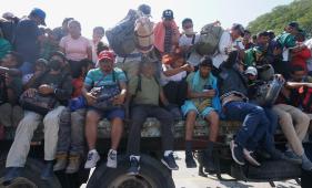 Los migrantes de la caravana avanzan en camiones por el sur de México
